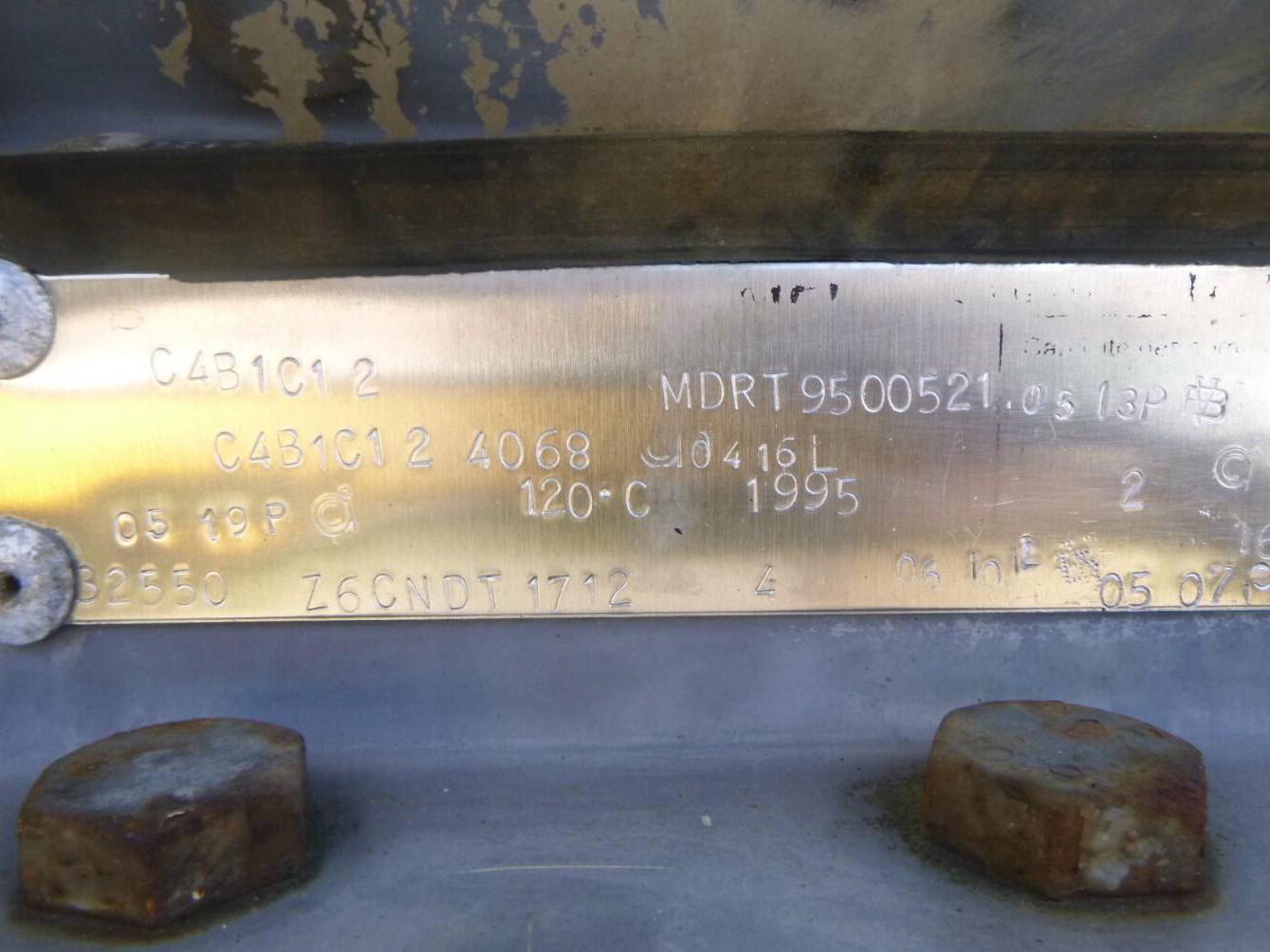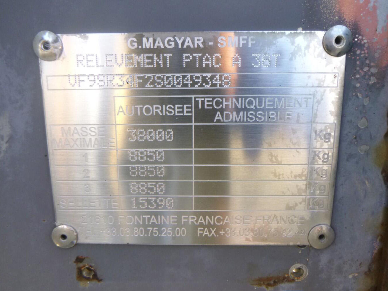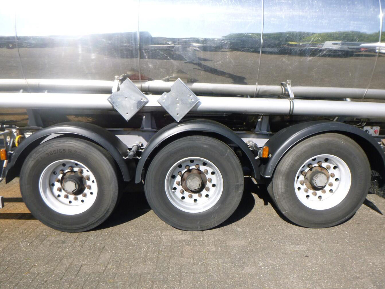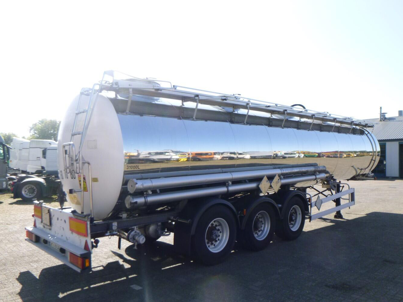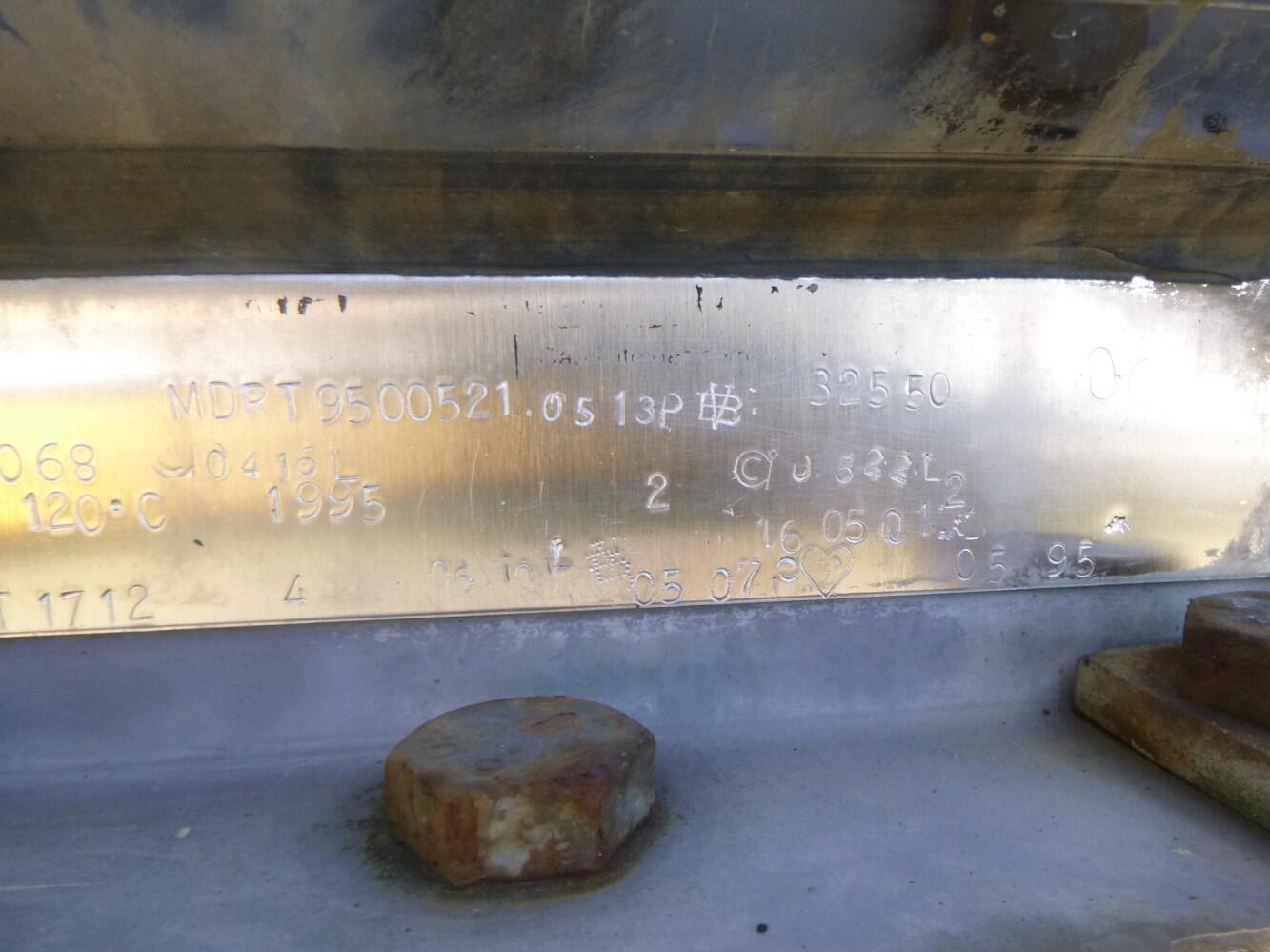 1995 Magyar Chemical tank inox 32.5 m3 / 1 comp – Insulated stainless steel (inox) chemical tank, Capacity 32550 liters, 1 Compartment, Test pressure 4.0 bar, Max working pressure 2.0 bar, Tank material code Z6 CNDT 17.12, Steam heating, Year of construction 1995, Air suspension, SAF axles, Drum brakes, ABS, Alloy wheels